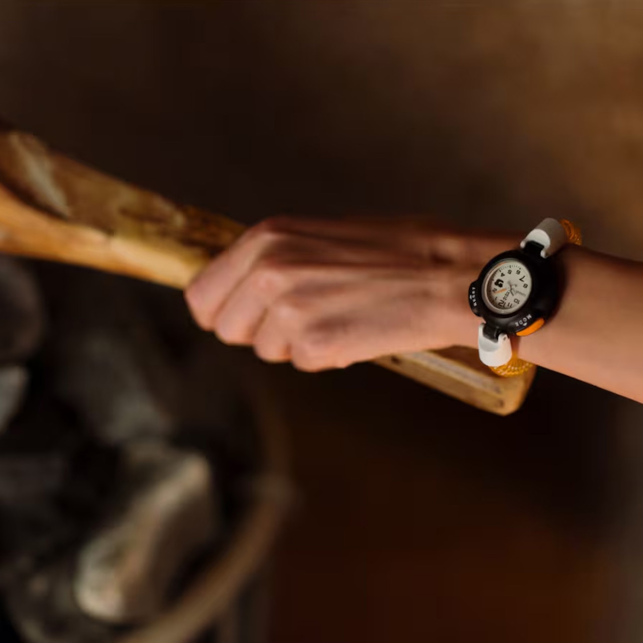高温多湿でも安心して使用できるよう独自の機能とデザインが施されています。ボタンひとつでサウナモードと通常時刻モードに切替可能。サウナに入った時間を忘れてしまう方も、簡単にサウナモードの12分計を使うことができます。また、シンプルな文字板と蓄光塗料を塗布した針で暗いサウナ室でも時間を確認できます。耐熱・耐湿性能を備え100℃以下のサウナで安心して装着でき、耐熱電池により熱に弱い内部部品には温度が伝わりにくくなっています。また、外装部品は火傷を避けるために樹脂を用い、唯一の金属ねじは肌に当たらないよう設計。湿気の入りにくい樹脂を使用し時計内部が曇りにくくなっています。