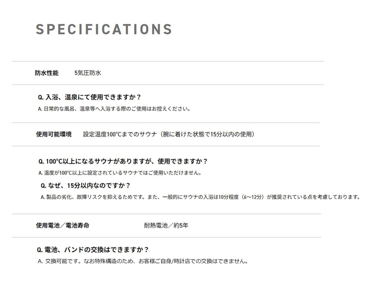 ●使用可能環境:設定温度 100℃までのサウナ(腕に着けた状態で 15 分以内の使用)