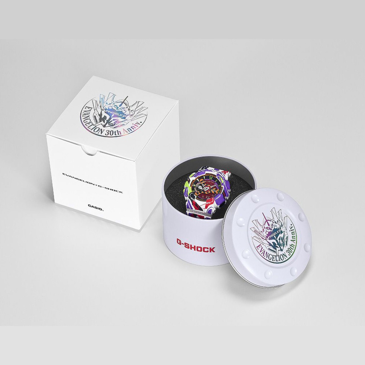 G-SHOCKと世界的に熱い支持を受けるアニメーション『エヴァンゲリオン』とのコラボレーションモデルです。TVシリーズ放映30周年の節目に、エヴァンゲリオンシリーズでメカニックデザインを担当している山下いくと氏に本モデルのデザインを依頼。G-SHOCK全体にエヴァンゲリオン初号機が描かれ、12時側のバンドには初号機の頭部装備である角、ベゼル部分には初号機の顔、ベゼル下部から6時側のバンドにかけてはロンギヌスの槍を投擲しようとする左腕がデザインされています。9時位置のインダイアル針に使徒のモチーフを採用し、文字板を分割させるY字型のパーツは作中で印象的なCAUTIONパターンをデザイン。遊環の「NEON GENESIS」、バンド先端のNERVロゴ、裏蓋の30周年記念ロゴなど細部に至るまでエヴァンゲリオンの世界観を表現しました。