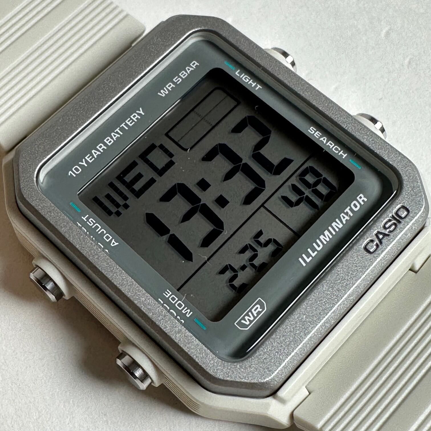 90年代のレトロなデザインを受け継ぎつつ、トレンドであるミッドサイズ&洗練されたスタイルを追求したW-221Hです。 ケース幅が38.4mmの程よいサイズ感は、男女問わず腕元になじみやすく日常使いに最適です。特徴的なスクエアケースにはメタリックベゼルをあしらいました。 視認性に優れたワイドスクリーンと曜日表示にはピクセルフォントを採用し、レトロな味わいを残しつつ見やすさを向上させています。バンドの取り付け部にはフラットなストライプパターンを施し、シンプルながらもアクセントの効いたデザインです。 さらに、約10年の電池寿命、5気圧防水、LEDバックライトを搭載し実用的な機能も充実。機能的でありながら誰でも使いやすいデザインが魅力です。 実用性とスタイルを兼ね備えたモデルです。